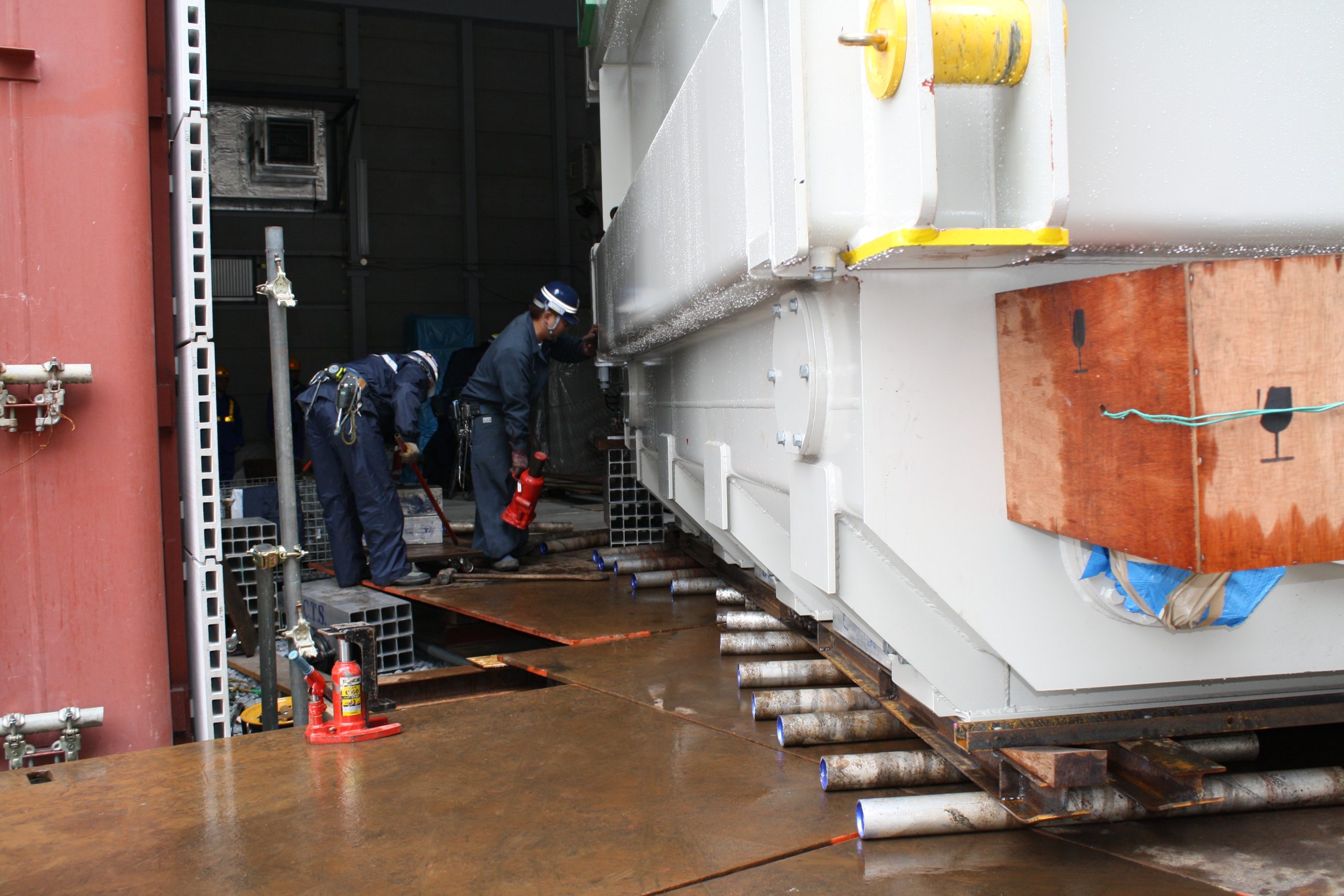 - 通常であれば車輪がついた機材で運搬するのですが、こちらの機械は超大型機械のため、該当する車輪のついた機材が選定できませんでした(使うと車輪が壊れてしまう)そのため、丸い棒(コロ)をたくさん敷いて、転がしながら機械を納品しました。